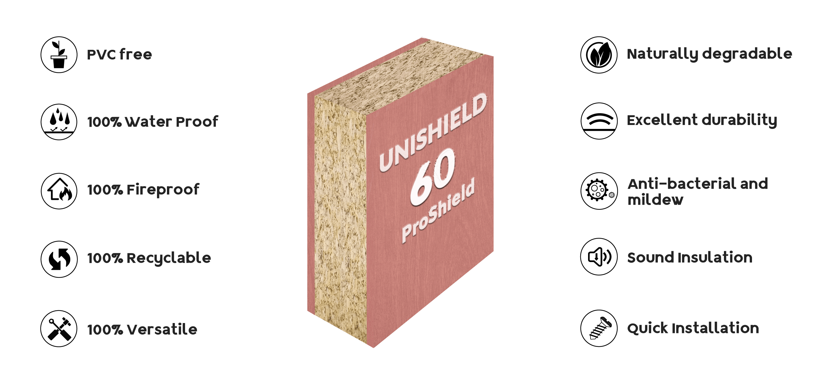 UNISHIELD 60 ProShield is a unique fireproof door core blank made from multi-layered wooden based products integrated with fireproof adhesive. An engineered solid core to resist the fire and smoke. Its acoustic property is an additional feature ensuring fire safety & comfort.