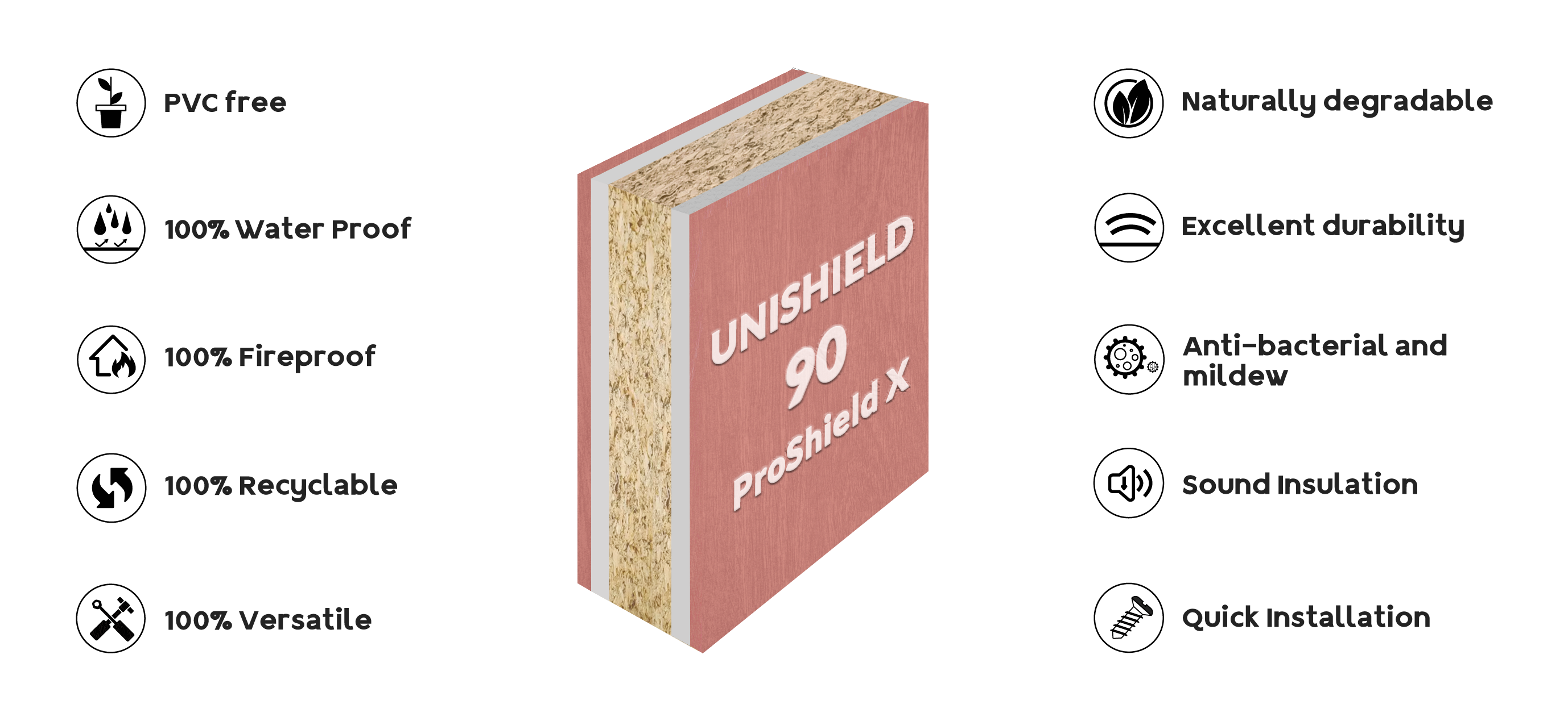 UNISHIELD 90 ProShield X is a unique fireproof door core blank made from multi-layered wooden based products integrated with Unishield fireproof special mineral with fireproof adhesive. An engineered solid core to resist the fire and smoke. Its acoustic property is an additional feature ensuring fire safety & comfort.
